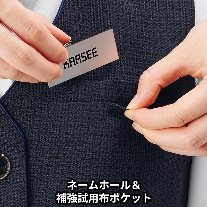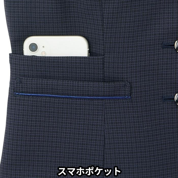 落ちやすいスマホがすっぽり入るポケット付きでお仕事の邪魔になりません。胸の浮きを抑えた立体的なパターンや背中のベルトで、後ろ姿まで抜かりのない美しいシルエットを実現します。