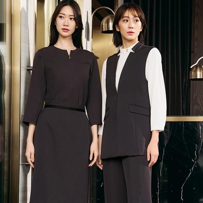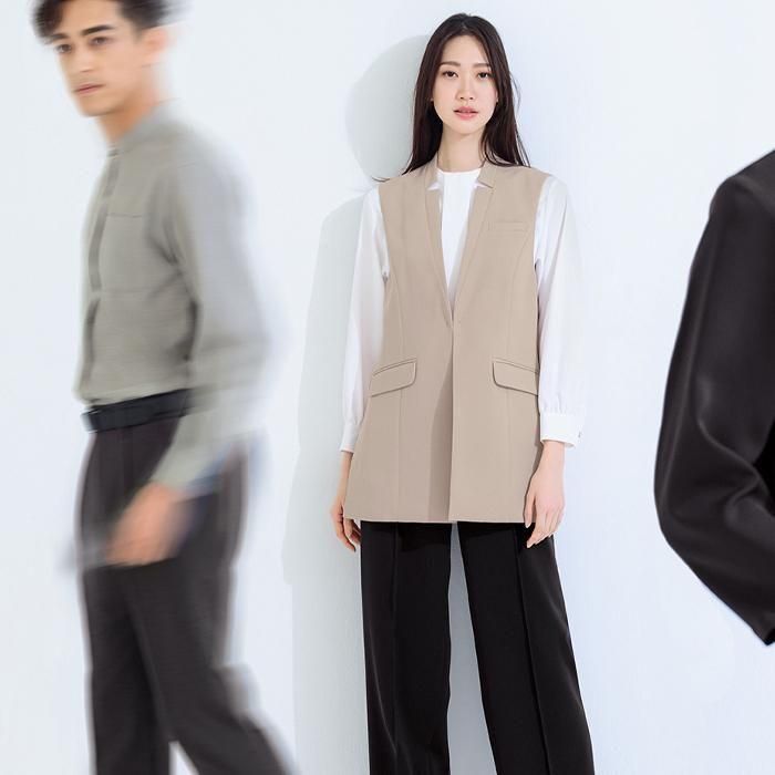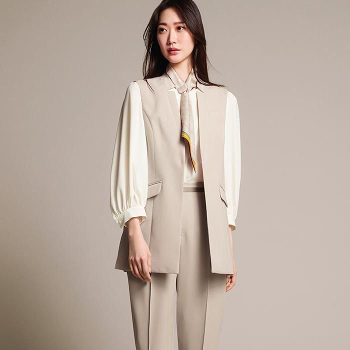 サラッと快適に羽織れる、ノーカラー×フロントホックデザインのジレです。