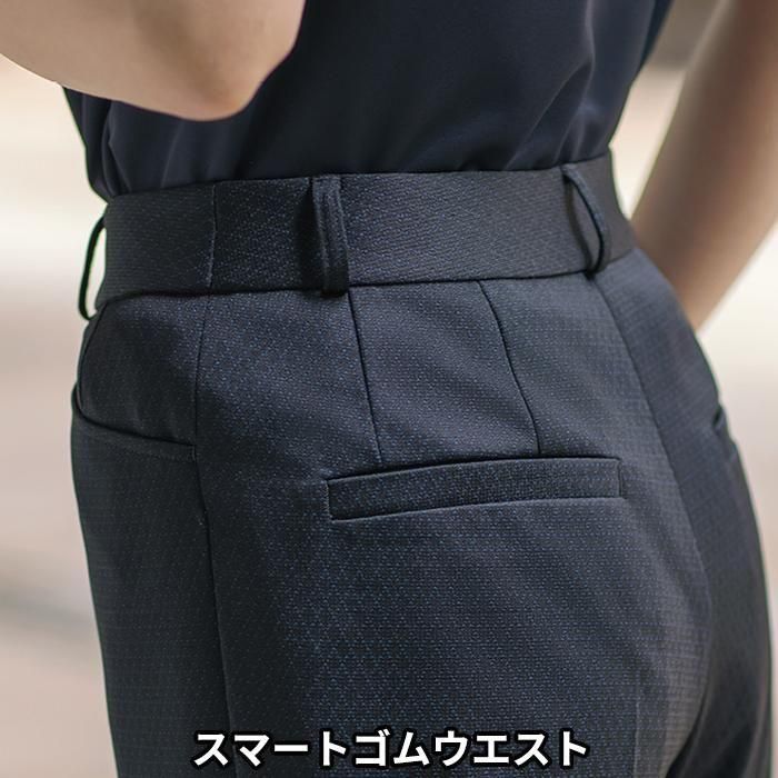 後ろベルトにカーブゴムを内蔵しイージーな履き心地ながら腰周りすっきりなシルエットを実現。