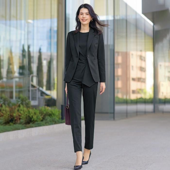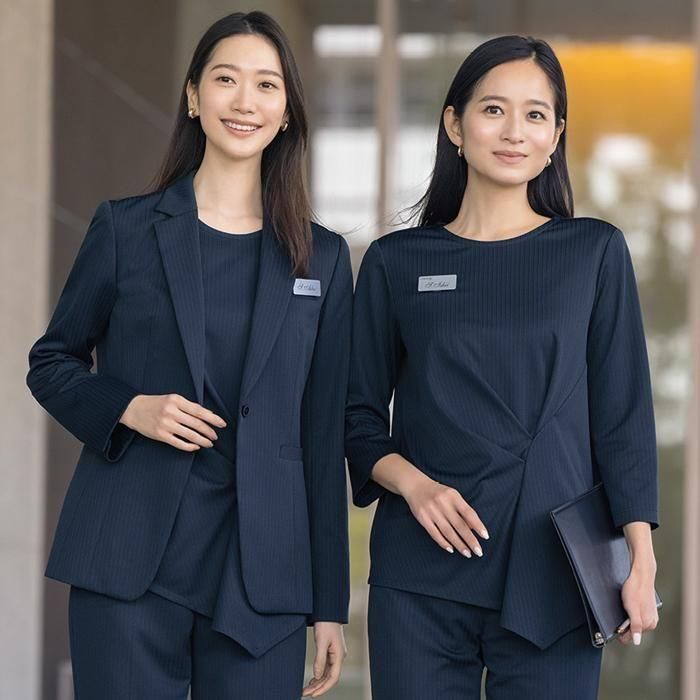 体形カバーもかなう長めの丈感もポイントで、販売や案内などの職種にぴったりの事務服です。