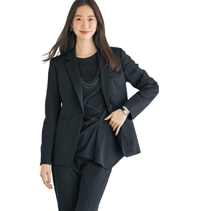 マニッシュだけど女性らしい、バランスが良いスッキリ見えストライプのストレッチ性の高いニット生地。